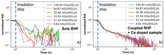 The RIE of the RHF decreased by 90% 1–2 s after the irradiation (Figure 8a). This decay also corresponded to the accelerator fall down measured by the ionizing chamber (Figure 6). Because of the coupling between RHF and Ce-doped sample, the decay of the RHF RIE in the coupled sample RIE decay should be identical in terms of delay. The rest of the decay should only be composed of the luminescence related to the Ce ions. Meyer et al. in [49] showed its continuous X-ray RIL decay is over 50 s for dose rates between 0.1 and 15 Gy(SiO2)/s. Regarding the measured decay time, the very long decay cannot be related to PL processes. However, Veronese et al. [52] reported phosphorescence emission for Ce-doped optical fiber with decay time exceeding a few seconds, compatible with the RIE decay observed here.
