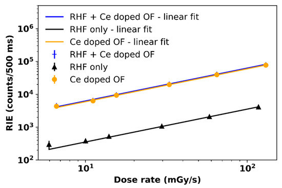 For the coupled RHF + Ce-doped OF, this is illustrated in Figure 9 by the blue crosses, which are combined with the RHF results in black dots. The RIE (counts/500 ms) is fitted with a linear function versus dose rate in the entire range with Equation (2) for both samples. By subtracting the signals from the two fibers, the RIE from the sole Ce-doped fiber can be calculated and is given in Figure 9. Table 1 summarizes the fit parameters used for the data for each fiber.
