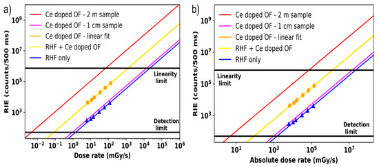 In Figure 9, the dose rate ranges from 4 to 133 mGy(SiO2)/s. The experiments carried out during the previous irradiations allowed us to consider an extension of the dose rates range: our PMT detectors were far from their saturation level, while remaining in their linear operating regimes. Supposing the RIE linearity can be achieved within an extended dose rate range, this sample of optical fiber of a few centimeters could be able, by extrapolation, to measure dose rates in a range between 10−1 and 1 Gy(SiO2)/s. This is illustrated by the red line in Figure 10a fitting the averaged RIE produced by the 11 cm sample of Ce-doped OF coupled to the RHF.
