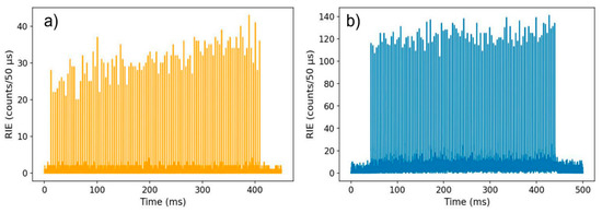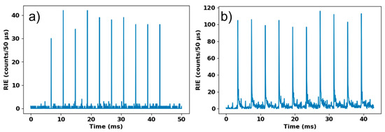 Each set of pulses was recorded as explained above, with the fiber irradiated at one meter from the target. The characterization of the pulsed mode consisted in matching the achieved number of pulses and the number of RIE peaks detected by the PMT. Typical results are illustrated in Figure 11a (RHF-only) and Figure 11b (Ce-doped+RHF).