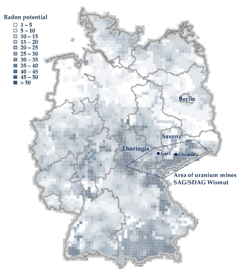 - Lehmann, F.; Hambeck, L.; Linhart, K.K.; Lutze, H.; Meyer, H.; Reiber, H.; Renner, H.K.; Reinisch, A.; Seifert, T.; Wolf, F. Belastung Durch Ionisierende Strahlung im Uranerzbergbau der Ehemaligen DDR; Hauptverband der Gewerblichen Berufgenossenschaften: Sankt Augustin, Germany, 1998. [Google Scholar]