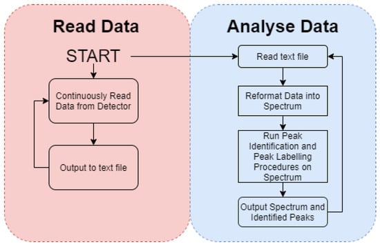 A number of commercial systems presently exist that afford the operator with the ability to perform such spectroscopic (peak) identification in real-time (or herein termed ‘online’) without delay, buffering and subsequent reprocessing of the as-parsed data-stream from the detector, using vendor-specific software packages and file-formats. One fundamental limitation, however, is the ‘lock-in’ of users to a manufacturer-specific detector-analysis package that is typically ‘tethered’ to a dedicated processing computer and hardware device (detector) owing to stringent and costly licensing conditions associated with its use. To hence remove this issue, while simultaneously allowing for the interchangeable use of differing radiation detection modules (from a range of manufacturers—including experimental systems, and of differing geometries, types and crystal compositions) to be carried by any one of a range of deployment systems, a compact, open source python module to undertake peak identification and quantification has been created.