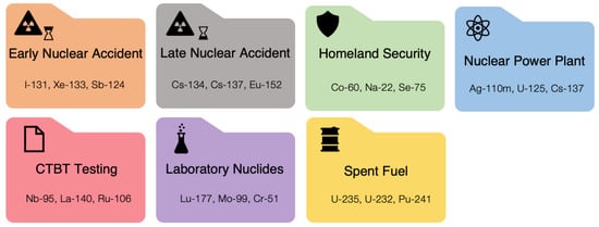 If the aforementioned initial ‘coarse’ peak ‘pre-screen’ identification fails to appropriately identify peaks based on the common interest suite of emitters (namely Cs-134, Cs-137, Co-60, Ag-110m, as well as those within the U and Th decay series) then a full search and fitting is performed. To facilitate a more accurate and efficient peak attribution from the algorithm by reducing the number of potential solutions, the contributing gamma-emitting isotopes are categorised into a number of libraries—a schematic representation of which is shown in Figure 3. During setup, the library most applicable to the scenario is selected by the user via the codes wrapper—although to avoid an incorrect ‘brute-force’ fitting if no peaks within the user-selected library are statistically appropriate, then the peaks contained in other libraries are searched for potential fits. This database is also included within the open-access code-base—with the details of the link to this repository contained within the information at the end of the manuscript. These seven libraries together comprise the scenarios for which gamma radiation would be encountered [21,22], and contain the isotopic information that is specific to each—albeit with a number of emitters common between groupings. For example, both I-131 and Xe-133 are specific to the ‘Early Nuclear Accident’ library (i.e., highly volatile radionuclides with short, days to week, half-lives that constitute the primary radioactive inventory following a reactor release event that are rapidly dispersed within the environment [23]), however, Cs-134 and Cs-137 are contained within both ‘Early’ and ‘Late Nuclear Accident’ suites (alongside being listed within other source libraries). While the ‘Early Nuclear Accident’ library comprised radioisotopes that are the primary inventory/dose contributor shortly after a reactor/site release, the ‘Late Nuclear Accident’ suite constitutes nuclides with longer (generally > 2 year) half-life that are not as volatile and short-lived. The species contained within the ‘Laboratory Nuclides’ comprise those used as part of biological tracing experiments or within medical procedures/treatments.