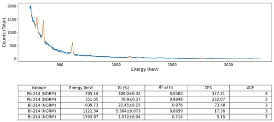 Peak-identified gamma-ray spectra, analysed after data collection (post-processed), for a NORM source. The table of isotopes includes: a RI for each peak, based on the integrated counts under the peak; an adjusted as the goodness of fit test for the modeled Gaussian distribution; a value for the integrated CPS under the peak and an ACF for the assigned isotope from 1 to 3. The duration of data collection was 5 min (real-time).
