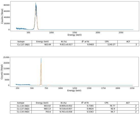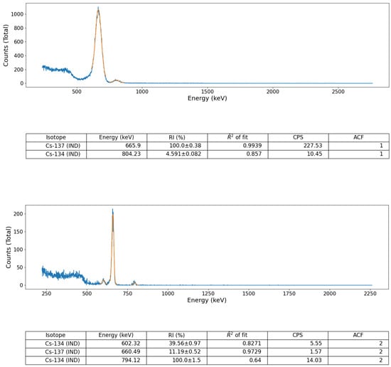 In contrast, the discrete single emission peak of Cs-137 represents a greater challenge for the materials radioisotope identification via this, as well as other algorithms—especially in online (live) where statistical/peak variations are introduced by data being continually appended into the array/text file. This is the result of the primary emission peak (at 662 keV) occurring close to those of Ag-111m (657 keV and 677 keV) causing uncertainty in the peak energy determination; especially when the contributing source is of low activity, at distance from the detector, or impacted by any shielding/attenuating interference(s). However, following the selection of the ‘Early Nuclear Accident’ or ‘Late Nuclear Accident’ radionuclide libraries within the peak identification algorithms wrapper code, as shown in Figure 6, the code-base is able to identify the Cs-137 contribution more often than if the full catalogue of isotopes were available for selection. As Cs-134 and Cs-137 (as well as other volatile and more short-lived radionuclides) are the primary radionuclides arising from an accidental nuclear facility release [21,28] (e.g., reactor loss of coolant incidents, reactor/fuel integrity losses as well as gaseous discharges from reprocessing sites) such as Chernobyl and Fukushima, before then residing in the environment for decades to follow as a result of their high fission product yield and longer half-lives, the radionuclides accurate identification is essential for both initial and long-term monitoring. To support such isotopic assay—both on-site and in the local/global environment, it is illustrated that this algorithm is able to perform online identification of the Cs-137 containing source material using both the Kromek GR1 and Hamamatsu C12137-01 detectors; the results of which are shown in Figure 6.