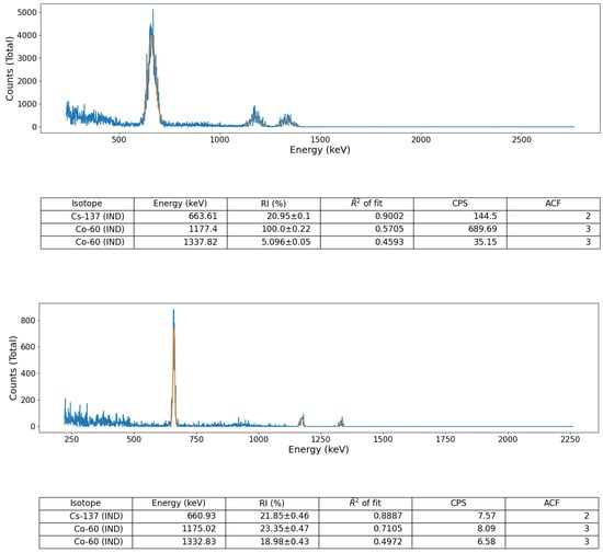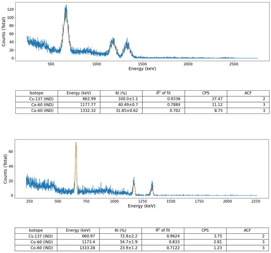 As is typical for instances where only one photopeak is identified by the algorithm, e.g., Cs-137 (N.B. while the Cs-137 gamma spectrum is characterised by a primary emission peak resulting from the 0.512 MeV − decay, through the Ba-137m isomeric level, its disintegration to the same Ba-137 ground-state is also via a 1.17 MeV − emission—alongside accessory escape peaks), any reference to inter-peak intensity will be non-existent as no other emission photopeaks are present within the spectrum obtained. Therefore, where no other isotopic identification has been successfully made, peak energy is examined exclusively within the identification algorithm when attempting to correctly attribute an isotope to a peak. The algorithm simply attempts to attribute the source with the closest gamma energy to the identified peak.
