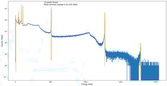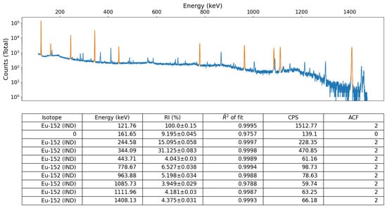 To additionally evaluate this peak-fitting methodology, the spectrum of a Eu-152 source, the spectrum of which had been recorded using a SAGe™ Well detector [27], was analysed by the module, using the “laboratory miscellaneous” isotope library. The result of post-processing this spectrum file through the algorithm is shown in Figure 10. The program was able to identify many of the emission peaks present and attribute the correct source. The thresholds here were set so that only peaks with heights above 0.5% of the maximum bin count recorded were identified. A confidence factor of was also chosen for this test. As can be seen, there is one peak that was discovered which could not be assigned an isotope at 161.65 keV. This is because in the library used, there are no listed peaks close to this energy. However, no photopeaks outside of those within the Eu-152 system were identified by the algorithm. The peaks show very small RI uncertainties within the Eu-152 peak identified spectrum. This is due to their high number of counts. The peak search was able to identify 10 peaks characteristic of the Eu-152 decay scheme with good energy resolution. The module performed as expected and with further refinement of the user specified values, such as an energy-efficiency relation, even more peaks may be identified and less errors may be observed.