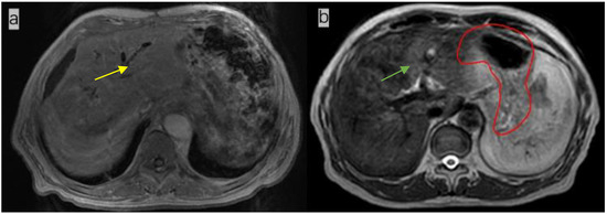 (a). Magnetic resonance image (MRI) of a patient (not the patient treated in this study) not treated with anisodamine; notice that the outline of the stomach is blurred (yellow arrow); (b) MR image of the patient treated with anisodamine; notice that the outline of the stomach is clearer (green arrow; the red line indicates the contours of the whole stomach).