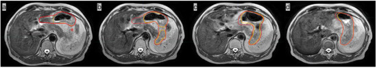- Daamen, L.A.; de Mol van Otterloo, S.R.; van Goor, I.W.J.M.; Eijkelenkamp, H.; Erickson, B.A.; Hall, W.A.; Heerkens, H.D.; Meijer, G.J.; Molenaar, I.Q.; van Santvoort, H.C.; et al. Online adaptive MR-guided stereotactic radiotherapy for unresectable malignancies in the upper abdomen using a 1.5T MR-linac. Acta Oncol. 2022, 61, 111–115. [Google Scholar] [CrossRef] [PubMed]