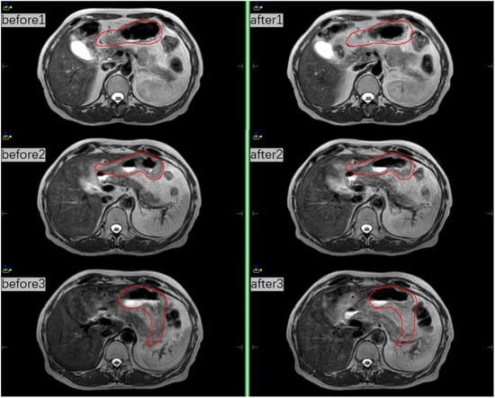MRI scans before and after treatment at three different fractions and the red line indicates the whole stomach.