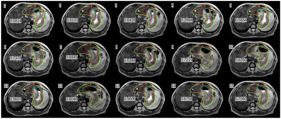 A 53-year-old male patient with a history of gastric bleeding and gastric ulcer for more than 18 years was selected for this study. The patient developed melena on 13 January 2022, without obvious causes. Contrast CT of the chest, abdomen, and pelvis showed that the wall of the gastric antrum was thick with two enlarged lymph nodes. Fluorodeoxyglucose positron emission tomography/CT (FDG-PET/CT) images revealed high FDG uptake in both the gastric wall of the inhomogeneously thickened greater curvature and the two enlarged lymph nodes. Pathological reports presented mucosa-associated lymphoid tissue (MALT) lymphoma in the greater curvature at the junction of the astral body, after performing immunohistochemistry of CD20+, CD43+, CD3+, BCL2+, CD5 minority+, CD23 minority-, CD38 minority+, CyclinD1 minority+, Lambda individual+, BCL-6-, Kappa-, Ki-67+10%. The patient was diagnosed with stage IIE gastric MALT lymphoma according to Ann Arbor staging. The patient received four cycles of rituximab, 600 mg, and then involved site radiation therapy (ISRT) on the whole stomach. The patient underwent a 4D CT scan on an empty stomach. Before the CT simulation, anisodamine (dose, 10 mg) was administered to reduce gastric motility. The entire stomach (clinic target volume, CTV) was delineated in the 4D CT scans, and the images were combined into an internal CTV (iCTV). The combined iCTV included the enlarged metastatic lymph nodes and the planning target volume (PTV), which presented a 5 mm external expansion from iCTV. The patient was treated with ISRT at 30 Gy in 15 fractions. Then, the patient was treated with the Unity MR-LINAC. Prior to each radiotherapy fraction, the patient was kept on an empty stomach and was administered anisodamine (dose of 10 mg). The empty stomach was delineated with automated segmentation using the AI technique, and then the resulting image was reviewed and modified by an attending radiation oncologist. The MRI image of the whole stomach after anisodamine administration was clearer than the images taken without administering the drug (Figure 1). The images obtained with the AI technology using deep learning algorithms showed that the delineation accuracy of the whole stomach gradually improved. The Dice similarity coefficient (DSC) increased gradually (Figure 2). The DSC measures the volumetric overlap of two sets of data and was obtained with the following Equation (1), which calculates the quotient of similarity between two volumetric sets with a value between 0 and 1. In this formula (Equation (1)), A and B are the target area volumes obtained by AI and manually corrected, respectively. A DSC of 1 means perfect segmentation, whereas a DSC of 0 means no overlap at all.