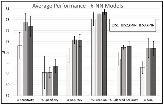 3,k-NN-trained models, since sensitivity, accuracy, precision, balanced accuracy, and AUC improved significantly, and specificity also improved, albeit not significantly.