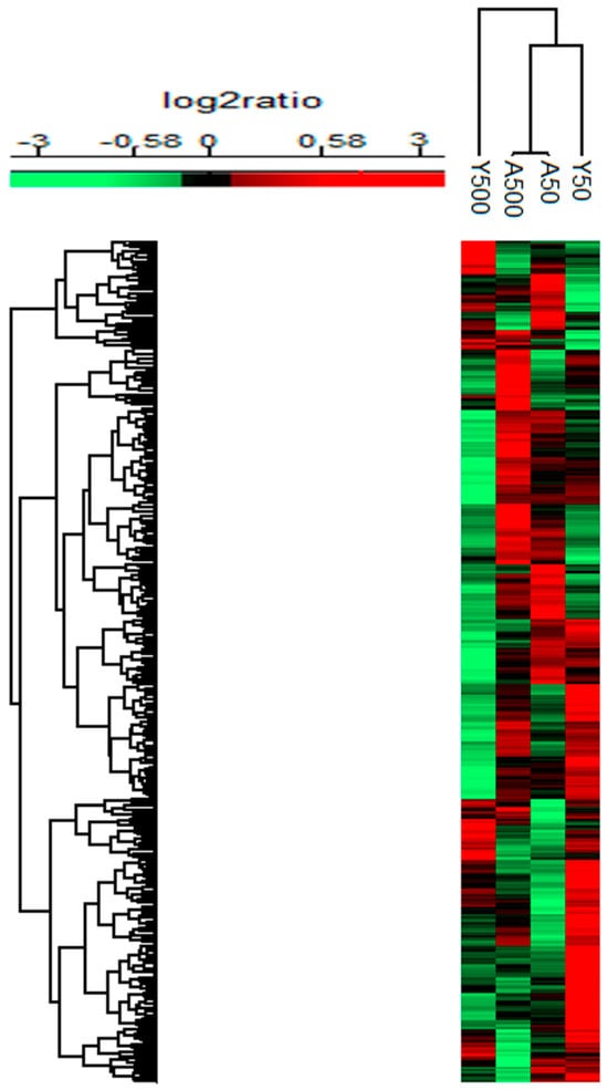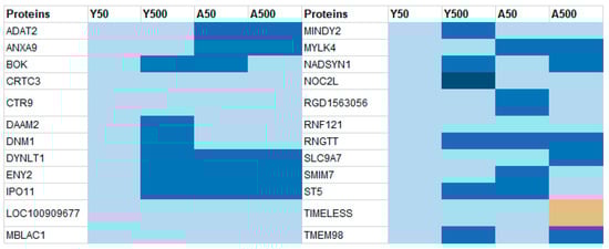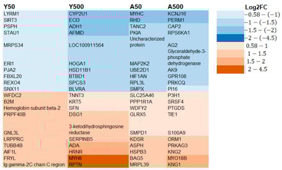 Compared to the controls, 758 proteins were differentially expressed in only one of the groups, that is, 42, 380, 168, and 168 proteins for the Y50, Y500, A50, and A500, respectively (Supplementary Table S1). A higher log2 ratio was generally seen for the proteins identified in the groups exposed to 500 kBq of 131I. The top 10 differentially expressed proteins with the highest increased and decreased expression for each group were identified (Figure 4). Of these 40 proteins, eight had a log2 ratio below −1.5, and six had a log2 ratio above 1.5. The following proteins had a log2 ratio in the interval of −1.5–(−2): cytochrome P450 family 2 subfamily U member 1 protein (CYP2U1; Y500), enoyl-CoA delta isomerase 2 (ECI3; Y500), alcohol dehydrogenase 1 (ADH1; Y500), arylformamidase (AFMID; Y500), myosin heavy chain (MYHC; A50), Rh blood group D antigen (RHD; A50), potassium inwardly rectifying channel subfamily J member 16 (KCNJ16; A500), PPARGC1 and ESRR induced regulator, and muscle 1 (PERM1; A500). The proteins with a log2 ratio in the interval of 1.5–2 were as follows: adenosine deaminase (ADA; Y500), hornerin (HRNR; Y500), myosin XVIIIB (MYO18B; A500), and kininogen 1 (KNG1; A500). The myosin heavy chain 8 (MYH8; Y500) and repetin (RPTN; Y500) proteins had a log2 ratio in the interval of 2–4.
