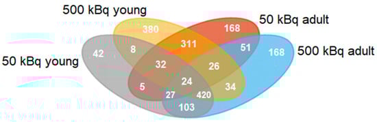 Venn diagram for the significantly regulated proteins after 131I exposure (injection of 50 or 500 kBq 131I) in young and adult rats compared to age-matched non-exposed rats. The 50 kBq young rat group (Y50) is represented in gray, the 500 kBq young (Y500) is represented in yellow, the 50 kBq adult (A50) is represented in red, and the 500 kBq adult (A500) is represented in blue.