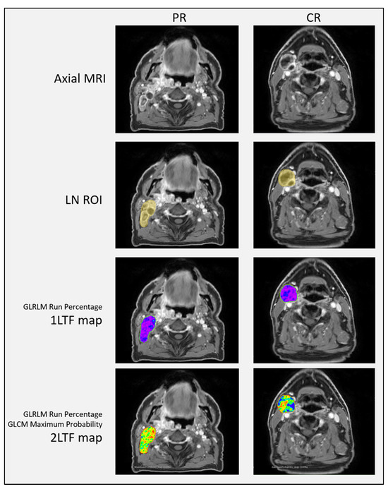 Axial MRI and associated LN ROI, 1LTF map, and 2LTF map for one PR and one CR patient showing the potential importance of spatial distribution of features as a source of phenotypic signaling.