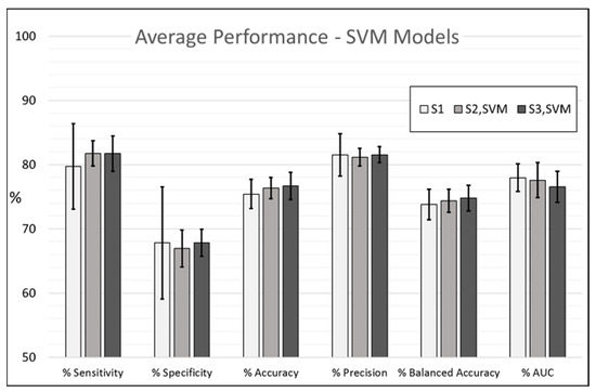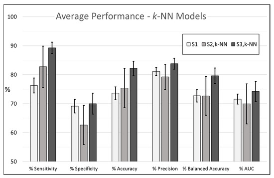 Figure 5 visually presents the results from Table 6. Comparing the performances of the k-NN classifier models trained using S1 to models trained using S3,KNN shows that with the exception of average specificity, all other metrics improved significantly with the inclusion of 2LTFs and 3LTFs. Average sensitivity increased from to , average accuracy from to , average precision from to , average balanced accuracy from to and average AUC from to .