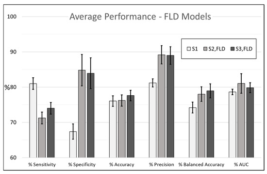 Finally, the results for the FLD classifier models trained using the S1 and S2,FLD feature sets are shown in Table 7, where it can be seen that average sensitivity decreased significantly from to , whereas average specificity, average precision, average balanced accuracy, and average AUC increased significantly from to , to , to , and to , respectively.