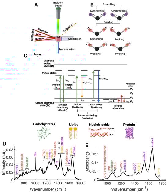 Basic principles of vibrational spectroscopy. (A) Interactions of incident light with a biological sample resulting in scattering (Mie, Raman (photons gain or lose energy), and Rayleigh (no change in photon energy)), reflection, absorption, and transmission of photons. (B) Graphical representation of stretching and bending vibrational modes of biomolecules due to interaction with the incident beam. (C) Energy-level diagram of IR (absorption, transmission and reflectance) and Raman scattering processes: Hν0 = incident laser energy, hνve = vibrational energy, νve = vibrational frequencies and Δν= Raman shift (energy difference between the incident beam and scattered photons; expressed as wavenumbers). At room temperature, the majority of molecules are in the S0 state. Thus, a larger proportion of molecules will exhibit Stokes Raman scattering. Typical Raman (D) and FTIR (E) spectra of a cell, where ν = stretching vibrations, δ = bending vibrations, s = symmetric vibrations, as = asymmetric vibrations, phe = phenylalanine, tyr = tyrosine and trp = tryptophan.