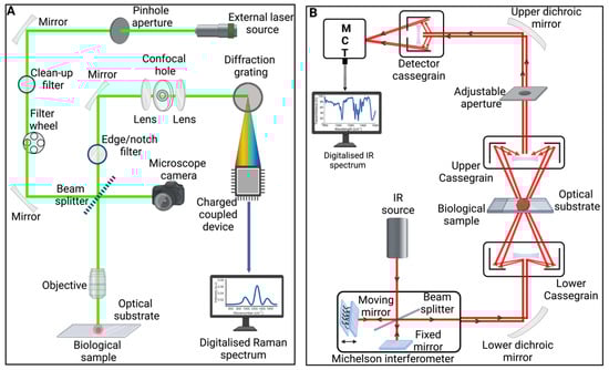 Schematic diagrams of the experimental set of a Raman (A) and FTIR (B) spectrometer.