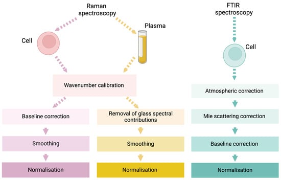 The choice of pre-processing method is not universal: it is highly dependent on the nature of the sample and the analysis modality. A typical pre-processing workflow used for cell and plasma Raman and FTIR spectra is outlined in Figure 3.