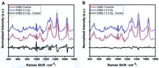 Effect of X-ray irradiation (2.3 Gy) on EBV+ and EBV- NPC cells. Comparison of mean LTs-RS spectra from (A) control group and radiated groups of CNE2 cells, (B) control group and radiated group of C666-1 cells []. The shaded areas (grey) indicate the standard deviations of means. The difference spectrum (2.3 Gy minus control) is shown at the bottom (black lines). Post-irradiation, radiosensitive CNE2 cells exhibited statistically significant DNA alterations, evidenced by changes in nucleic acid-related spectral bands (752, 1264, 1335 cm−1), amide I and II (1264 cm−1 and 1655 cm−1), and lipid bands (1065, 1297, and 1655 cm−1).