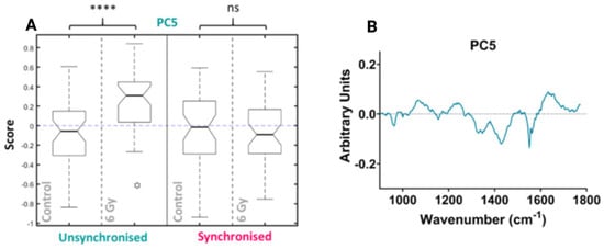 PCA revealed PC5 to be the most important for classifying the irradiated synchronised and unsynchronised cells (Figure 5A,B). The PC5 loading box plot in Figure 5A displays a significant increase in PC score between the control and the unsynchronised cells, indicating greater radiation-induced biochemical differences. Protein and amide III (963, 1235, 1429 and 1631 cm−1) modifications were the most prominent biomolecular signals (Figure 5B) and could be attributed to activation of cell cycle repair processes.