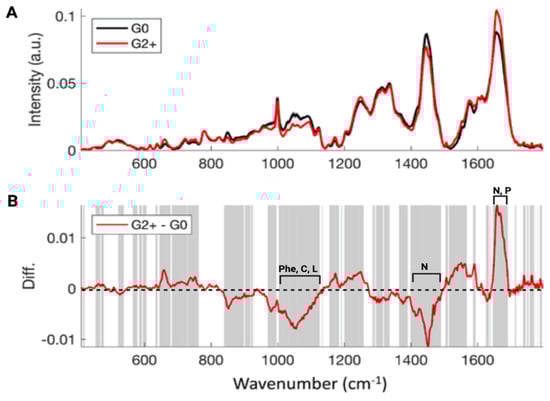Biological materials are commonly analysed over the fingerprint region of Raman (400–1500 cm−1) and IR (600–1500 cm−1) spectra [,,], and the major biological assignments across the spectral regions related to proteins, nucleic acids, carbohydrates, and lipids are highlighted in Figure 1D,E.