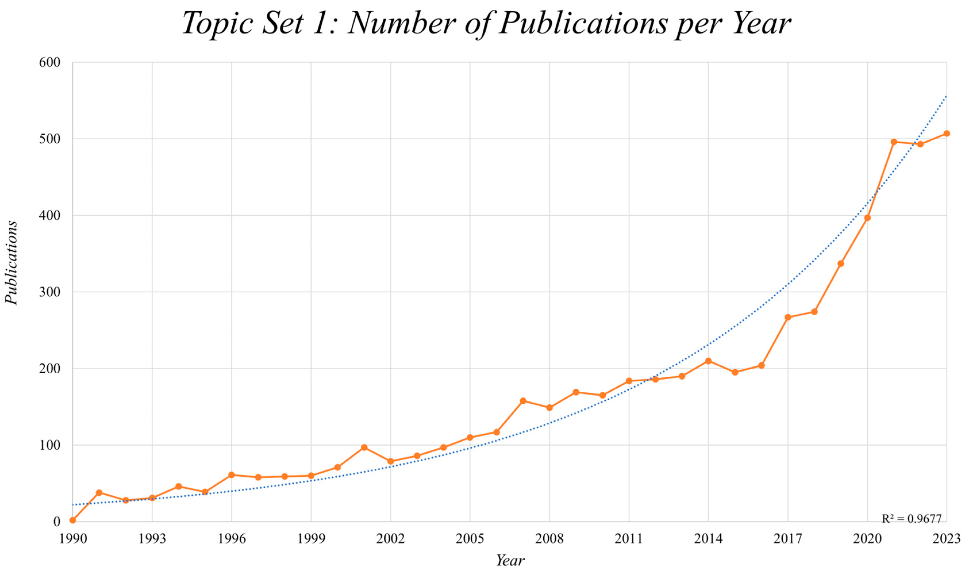 3.15. Analysis of Growth Trends in Publications for Space Radiation, Mars, Galactic Cosmic Rays, Cognition, and Humans from 1990 to 2023