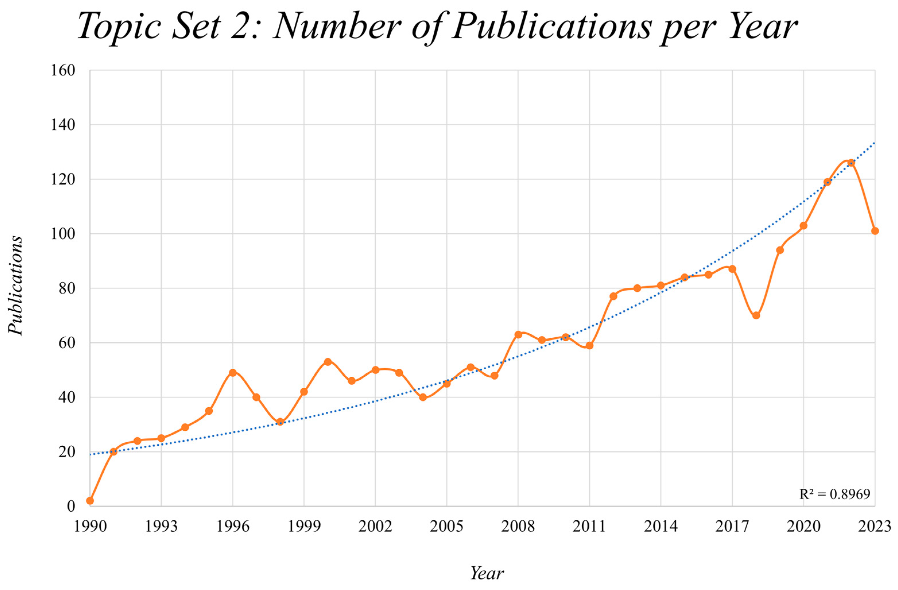 4.5. The Evolution of Bibliographic Terms for Topic Sets 1 and 2 over Each Corresponding Decade