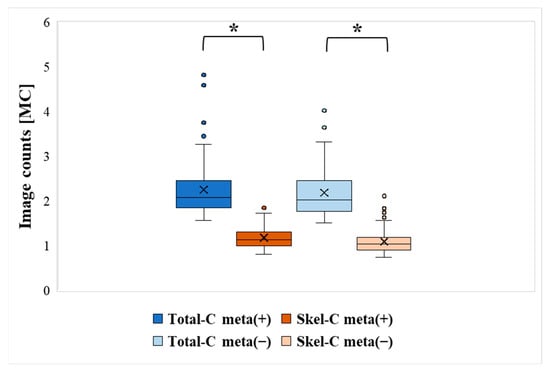 All patients were grouped on the basis of the presence or absence of bone metastases. The mean, median, minimum (Min), maximum (Max), and SD of Total-C and Skel-C are summarized in Table 2, with the results of significance tests shown in Figure 2. Skel-C was significantly lower than Total-C in cases with and without bone metastases. Additionally, Skel-C exhibited a lower SD and less variability in counts than Total-C.
