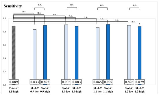 Sensitivity and significance tests for each group, classified based on the threshold of Skel-C (n.s.: not significant).