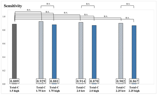 Sensitivity and significance tests for each group, classified based on the threshold of Total-C (n.s.: not significant).
