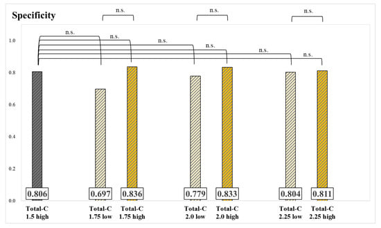 Specificity and significance tests for each group, classified based on the threshold of Total-C (n.s.: not significant).