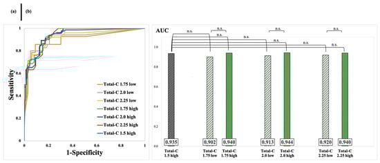 (a) ROC curves of groups classified based on the threshold of Total-C and (b) AUC values and results of significance tests for each group (n.s.: not significant).