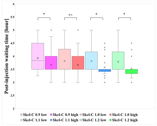 Distribution of post-injection waiting times and results of significance tests for each group stratified by Skel-C threshold. (*: p < 0.05, n.s.: not significant).