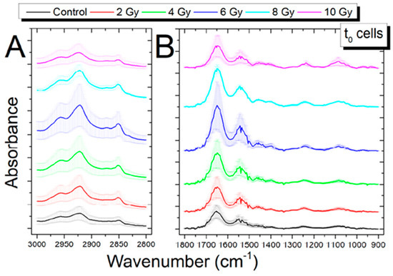 Average FT-IR spectra in the region 3000–2700 cm−1 (A) and in the region 1800–900 cm−1 (B) between the control cells (0 Gy) and irradiated cells (2, 4, 6, 8, 10 Gy) fixed immediately after X-ray exposure. The spectra are shifted in absorbance to allow the comparison, data are presented as Mean ± SD. Reproduced under Open Access conditions from Ref. [32].