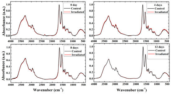 Average of FT-IR spectra from control and irradiated rat erythrocyte samples at 0, 4, 8, and 12 days after irradiation (reprinted from Ref. [38] under Open Access conditions).