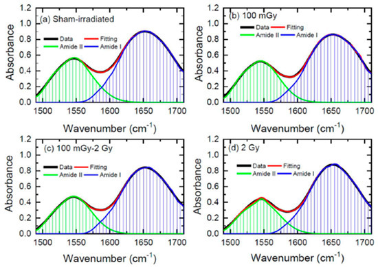 In Ref. [46], the authors evaluated the ratio between the β-sheet and α-helix components of Amide bands using the above-mentioned deconvolution procedure. They reported that when the 2Gy irradiation was preceded with a smaller dose of 100 mGy, or when the animals were irradiated with the low dose only (100 mGy), no change in the ratio was observed, which was different from the case in which the animals were irradiated with the 2 Gy dose.