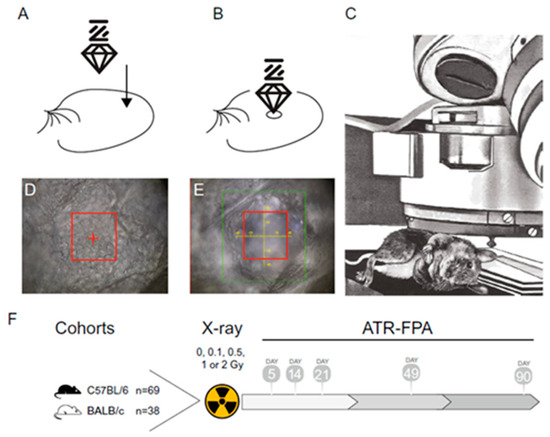 Experimental procedure description. (A) Immobilized mouse ear with germanium crystal above it and (B) crystal position during measurements. (C) Anesthetized animal under the microscope. (D) Phase contrast image of the external layer of stratum corneum before the measurement. (E) Phase contrast image of the deformation of the stratum corneum caused by germanium crystal after the measurement. (F) Two strains of mice, C57BL/6J (n = 69) and BALB/cJ (n = 38), were used. All mice were treated with total body irradiation of either 0, 0.1, 0.5, 1, or 2 Gy at 9–12 weeks of age. At 5, 14, 21, 49, and 90 days after irradiation, mice were anesthetized, and measurements of ear pinnae were collected using ATR geometry (reproduced from Ref. [47] under Open Access conditions).