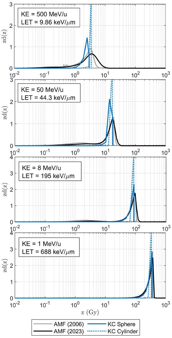 - Parisi, A.; Furutani, K.M.; Sato, T.; Beltran, C.J. Comparative Evaluation of Two Analytical Functions for the Microdosimetry of Ions from 1H to 238U. Quantum Beam Sci. 2024, 8, 18. [Google Scholar] [CrossRef]