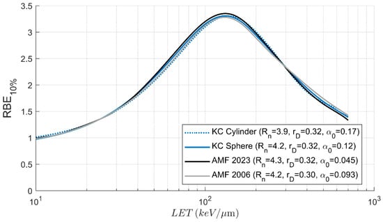 - Hartzell, S.; Guan, F.; Magro, G.; Taylor, P.; Peterson, C.; Kry, S. Quantifying sensitivity of carbon RBE models to reference parameter variations. Radiat. Res. 2025. [Google Scholar] [CrossRef]