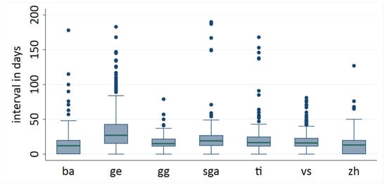 Citizens in metropolitan regions (ge, zh, ba) had a mean waiting time from diagnosis-to-surgery of 22.3 days, whereas those in decentralized regions (sga, gg, vs, ti) had a mean waiting time of 15.7 days (p < 0.001) (Table 2). Radiotherapy initiation was also delayed in metropolitan regions compared with rural regions (59 vs. 53 days, p < 0.001). Box plots of the median time from biopsy-to-surgery for each cancer registry revealed significant disparities in both median intervals and data distributions (Figure 1).