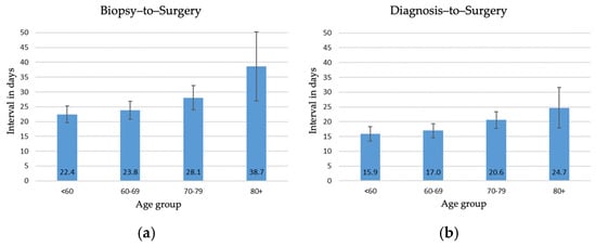 Mean time intervals from biopsy-to-surgery (a) and from diagnosis-to-surgery (b) according to age (p < 0.001). The mean values and the 95% confidence intervals are reported.