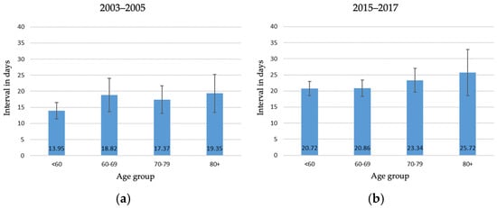 Mean interval diagnosis-to-surgery according to age in Eastern Switzerland between 2003–2005 (a) and 2015–2017 (b). Reported are mean values and the 95% confidence intervals.