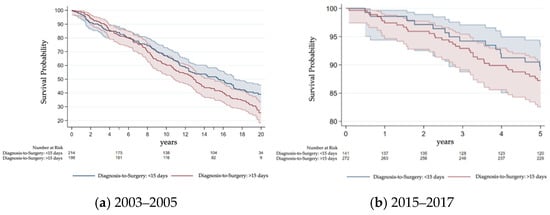 Kaplan–Meier curves for OS for the time periods 2003–2005 (a) and 2015–2017 (b) for patients with the interval diagnosis-to-surgery <15 days versus >15 days in Eastern Switzerland.