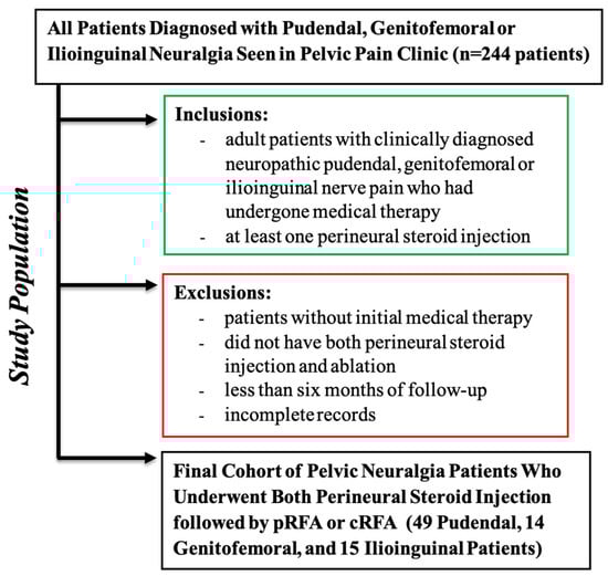 The inclusion criteria were adult patients (≥18 years) of all genders, clinically diagnosed with pelvic neuralgia, having received medical therapy and at least one injection before their first RFA. Exclusion criteria included patients who did not undergo initial medical therapy, patients with less than six months of follow-up post-procedure, and those with incomplete electronic health records. Selection methodology can be illustrated in Figure 1.