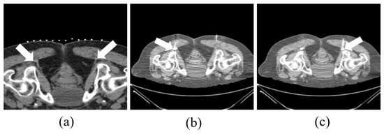 CT Acquisitions Portraying Pulsed Radiofrequency of the Pudendal Nerve. (a) Planning CT image demonstrates the isodense right pudendal nerve located posterior to an adjacent blood vessel (white arrows); (b) Axial CT shows post-procedure changes following probe placement within Alcock’s canal targeting the left pudendal nerve (white arrow); (c) Axial CT shows similar post-procedure changes with the probe introduced into Alcock’s canal targeting the right pudendal nerve (white arrow).