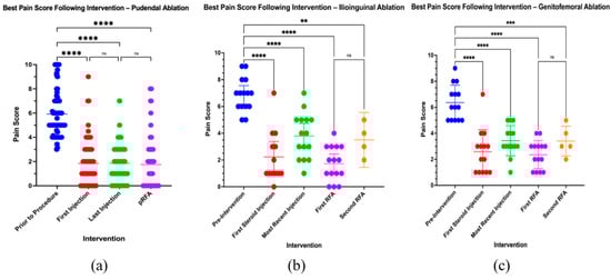 Best Pain Score Following Steroid Injection and RFA by Nerve Ablated. (a) Pudendal ablation; (b) Ilioinguinal ablation; (c) Genitofemoral ablation. Asterisks indicate levels of statistical significance: ** = p < 0.01; *** = p < 0.001; **** = p < 0.0001. “ns” = not significant.