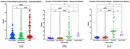 Duration of Pain Relief in Weeks Following Steroid Injection and RFA by Nerve Ablated. (a) Pudendal ablation; (b) Ilioinguinal ablation; (c) Genitofemoral ablation. Asterisks indicate levels of statistical significance: *** = p < 0.001; **** = p < 0.0001. “ns” = not significant.
