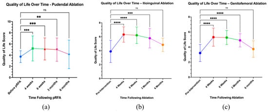 Quality of Life Scores Following cRFA by Nerve Ablated. (a) Pudendal ablation; (b) Ilioinguinal ablation; (c) Genitofemoral ablation. Asterisks indicate levels of statistical significance: ** = p < 0.01; *** = p < 0.001; **** = p < 0.0001. “ns” = not significant.